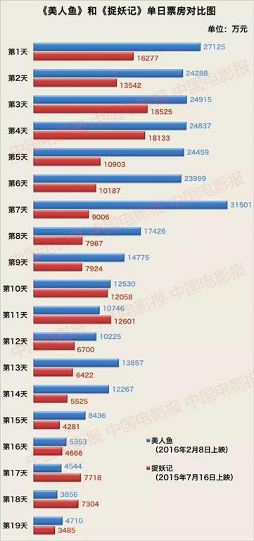 电影《美人鱼》在2月8日上映后,面对《西游记之孙悟空三打白骨精》和《澳门风云3》两个强劲对手,首日票房便突破2.7亿。此后,该片连续7天单日票房突破2亿,连续14天单日票房超过亿元,直到2月24日,该片上映的第17天,单日票房才低于5000万。