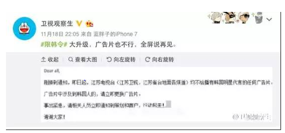 就当很多人以为“限韩令”风声已经过去时。这两天博主“@卫视观察生”晒出了疑似江苏卫视不得播有任何韩国明星代言广告片的内部通知截图,也有知情人透露央视、北京卫视均向代理商紧急通知所有涉及韩国元素的广告全部停播,同时媒体发现在9月以后韩星演出均未获审批,有知情人向腾讯娱乐记者透露,近日广电总局临时开会口头下达了即日执行“限韩”的指令,其态度非常坚决。