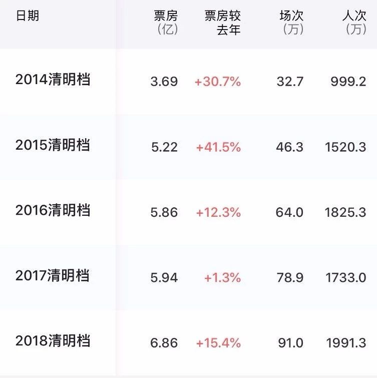 然而,今年的清明档期却有了不一样的变化,2018年清明档(4月5日-4月7日)总票房约6.86亿元,相比去年上涨15.4%,增长速度上也呈现出了加速趋势。