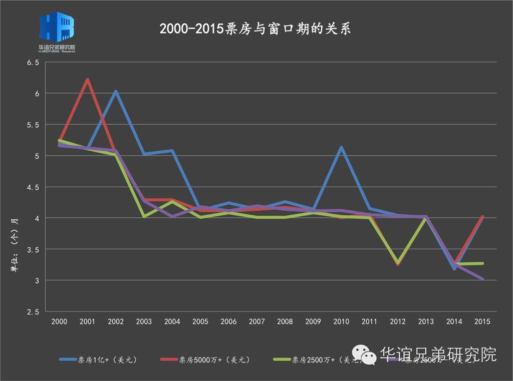下图是2000—2015北美家庭录像窗口开放时间与电影票房的关系: