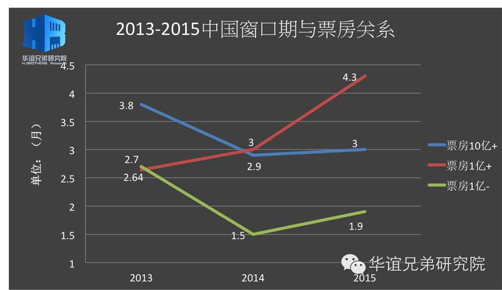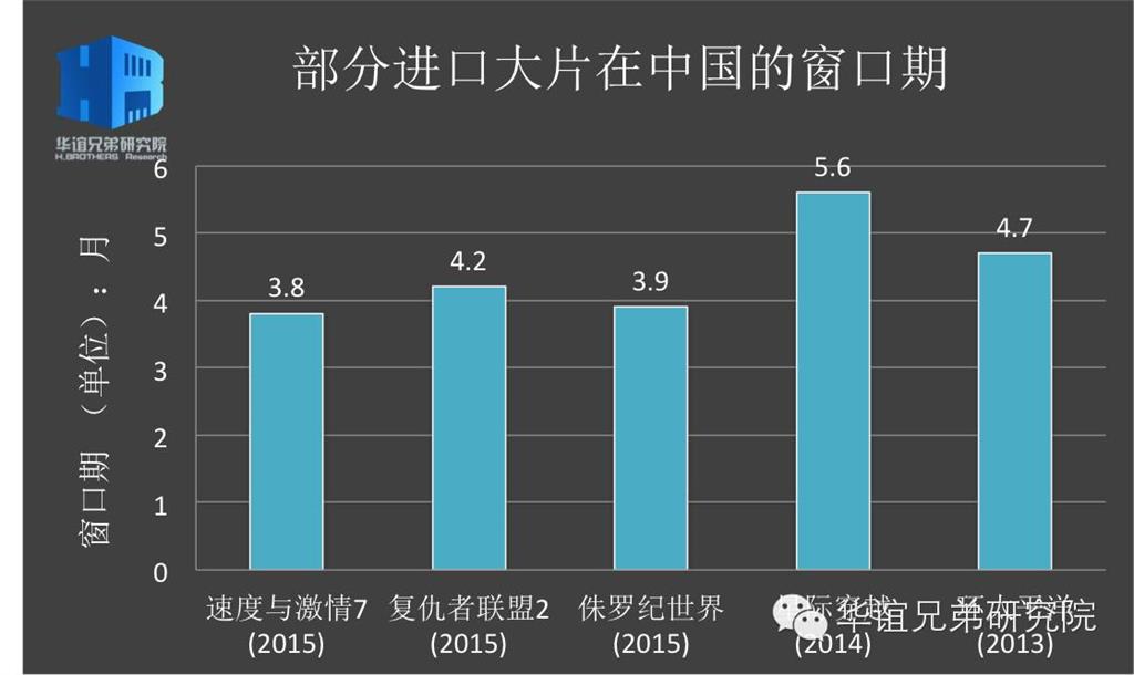 《速度与激情7》、《复仇者联盟2》和《侏罗纪世界》都是2015年票房超过10亿的影片,与(图3)国内的10亿票房影片的平均窗口期3个月相比,这些影片的窗口期远远高于平均值。《星际穿越》获7.5亿票房,与2014年电影(1-10亿票房)的平均窗口期3个月相比,高出2.6个月。《环太平洋》也高出同年同等电影平均窗口期1.9个月。据不完全考证,我们可以推测,国外大片的高票房除了其本身电影和宣传引国人瞩目以外,其远高于国产片的窗口期也有相当的贡献。