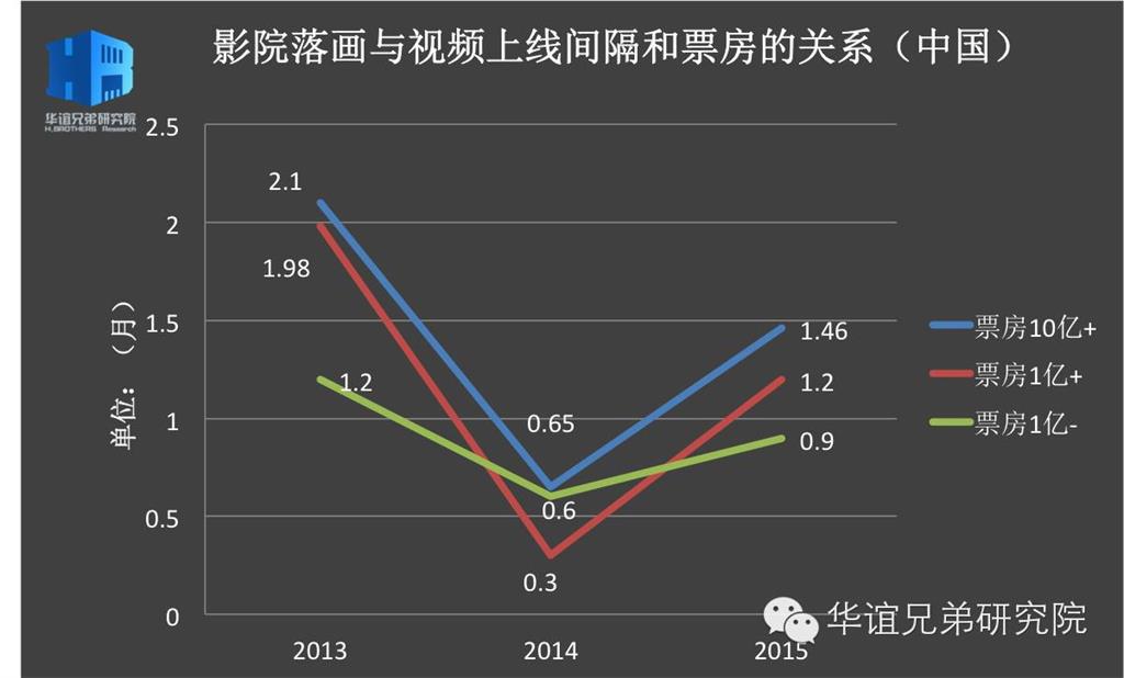 从2013到2015,间隔期明显下降,这是窗口期逐步缩短的反映。且间隔期也与票房成正相关(即:蓝线>红线>绿线)。某些国产片甚至还未从影院完全下线,视频网站就已迫不及待上线:2013年的《中国合伙人》影院落画时间为2013年7月12日,而视频网站在2013年7月1日就已上线;同年的《私人订制》影院下映时间为2014年2月13日,而网络视频提早一周上线。而此类情况,正在逐渐增多。