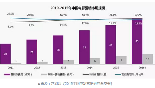 近年来,中国电影产业的快速发展,促进产业进一步市场化,也令票房竞争驶入红海,各部影片宣发比重提高,宣发市场体量也随之水涨船高。根据艺恩网的数据,2015年中国电影票房突破440亿的同时,当年的电影宣发市场规模突破38亿元,较2014年同比增长15.2%,预计2016年市场规模将达到46亿元。市场整体上涨当中,新媒体营销这一领域成为国产影片宣发的突出增长点,其规模在过去5年间增长了8倍,从2011年的1亿元,增长到2015年的8亿元,预计2016年将会增长至10亿元的量级①。尽管宣发投入整体增速不低,且有强劲增长点,但是和2015年国内市场总票房接近38%的增速相比,整体差距仍较为明显。由此看来,宣发投入及市场规模在未来具备提升空间。