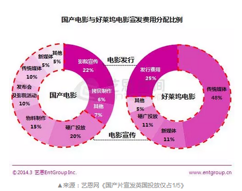 艺恩网2014年曾对国产电影与好莱坞电影的宣发成本各部分配比进行了总结和梳理。据统计,国内单部影片的总体宣发成本中,34%用于影院宣传及相关的影院活动,20%用于硬广投放。而在好莱坞,用于硬广投放的费用仅为11%,但在传统媒体投入中,好莱坞的投入占比达到近一半,是国产电影同类投入的近5倍。一个显著而直观的差异是,国产电影重视影院宣传,而好莱坞电影仍然更钟情于传统媒体的传播推广。这方面的差异虽在意料之中,但是造成差异的原因仍值得深入探讨。