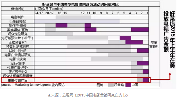 从上一图表的对比中可以发现,好莱坞电影的典型宣传规划甚至早于电影制作启动,其宣传期也普遍长于国内,且每一步宣传动作都早于国内电影的一般宣传流程。如预告片的制作,成片后的试映活动,付费广告的投放等都会较国产电影早1-7个月不等。