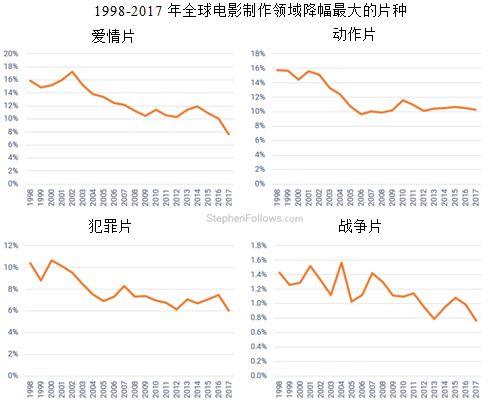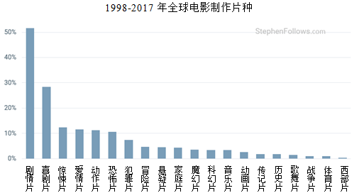 例如,尽管爱情片在所制作的影片中所占的比例较小,但原始制作数量仍在不断增加。1998年,全球爱情片数量为410部,2017年这一数字达到887部。爱情片的数量翻番,但是由于同期全球电影制作数量增加了四倍,因此爱情片的受欢迎程度看起来相对下降。