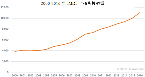 IMDb目前有12597部2017年首次上映的影片,这一数字是十年前的两倍。