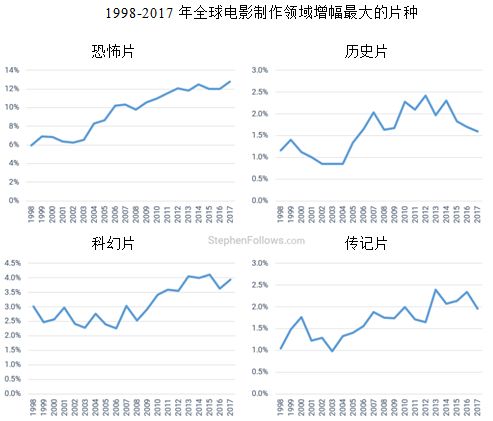 在去年一项对恐怖片的研究中发现,恐怖片在过去十年左右的时间里如何实现惊人增长的情况。20年前,恐怖片占所有影片的4.3%,而2017年恐怖片占12.4%。越来越受欢迎的其他片种有历史片、科幻片和传记片。
