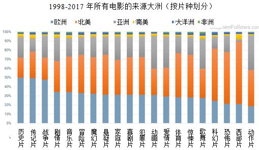 下图显示的是,过去二十年各片种的影片来自哪个大洲。例如,过去20年所制作的所有历史片中有50%来自欧洲国家。另一个证据也说明欧洲电影制作人对历史题材的兴趣超出平均水平,因为他们对传记片和战争片的兴趣分别排在第二位和第三位。