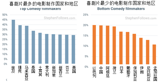 埃及是制作喜剧片最多的国家,45%的电影都是喜剧片。伊朗、尼日利亚和孟加拉国是制作喜剧片最少的国家。