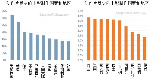 香港四分之一以上的影片都是动作片,印度五分之一的电影也是动作片。