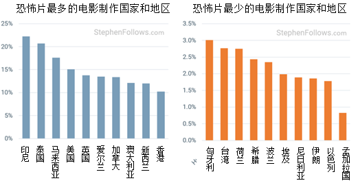 美国是世界上最大的恐怖片制作国。但如果我们不看电影产量,只看恐怖片在电影总产量中的占比,那么美国排在印尼、泰国和马来西亚之后位列第四。