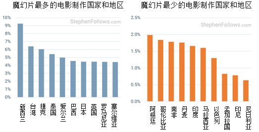 新西兰可谓魔幻片的拍摄胜地,六部《指环王》都是新西兰取景拍摄。研究所涵盖的20年间,新西兰制作的所有电影,近10%为魔幻片。