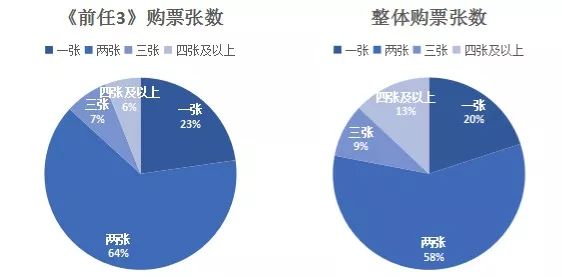 根据淘票票提供的数据,尽管在《前任3》的观众中,购买两张票的观影群体占比最大,但购买一张票也占到了23%,高于大盘平均值的20%。
