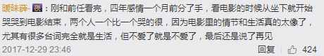 而且,女生在观影后更热衷于分享,发朋友圈,成为影片“自来水”。再加上最近有女生看完《前任3》后在影院痛哭的短视频刷爆社交平台,更让不少女生欲罢不能。试问有多久没有痛痛快快哭一次了呢?